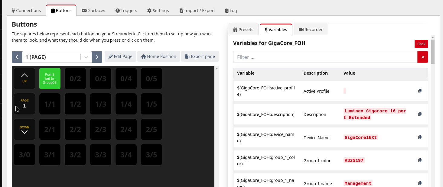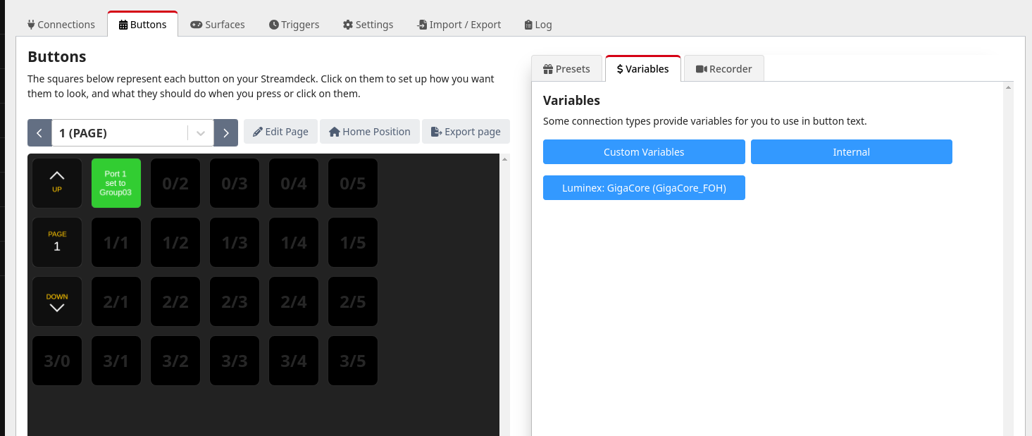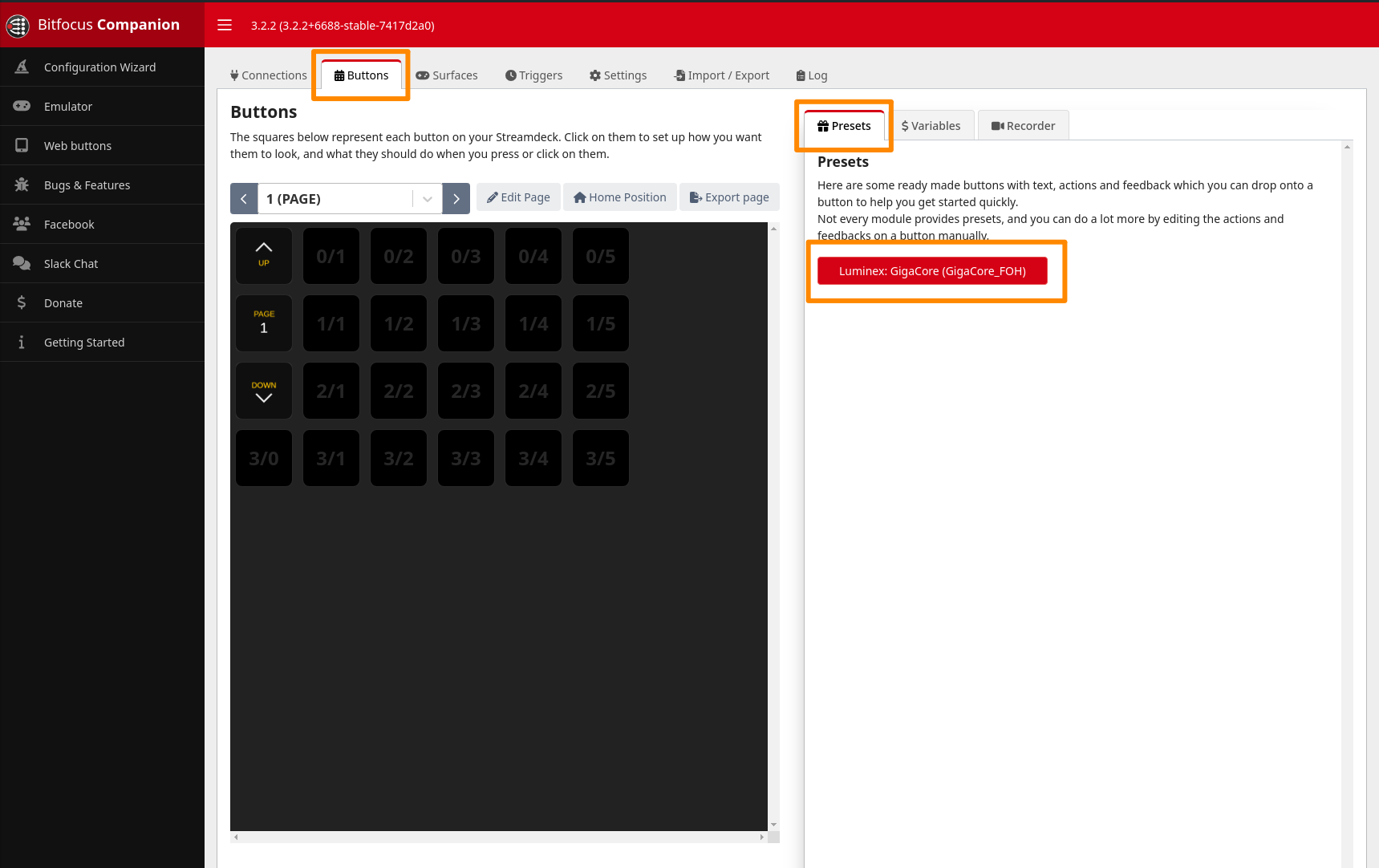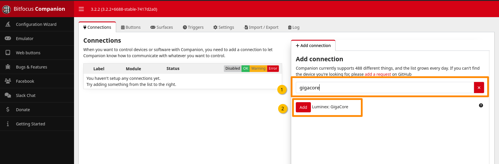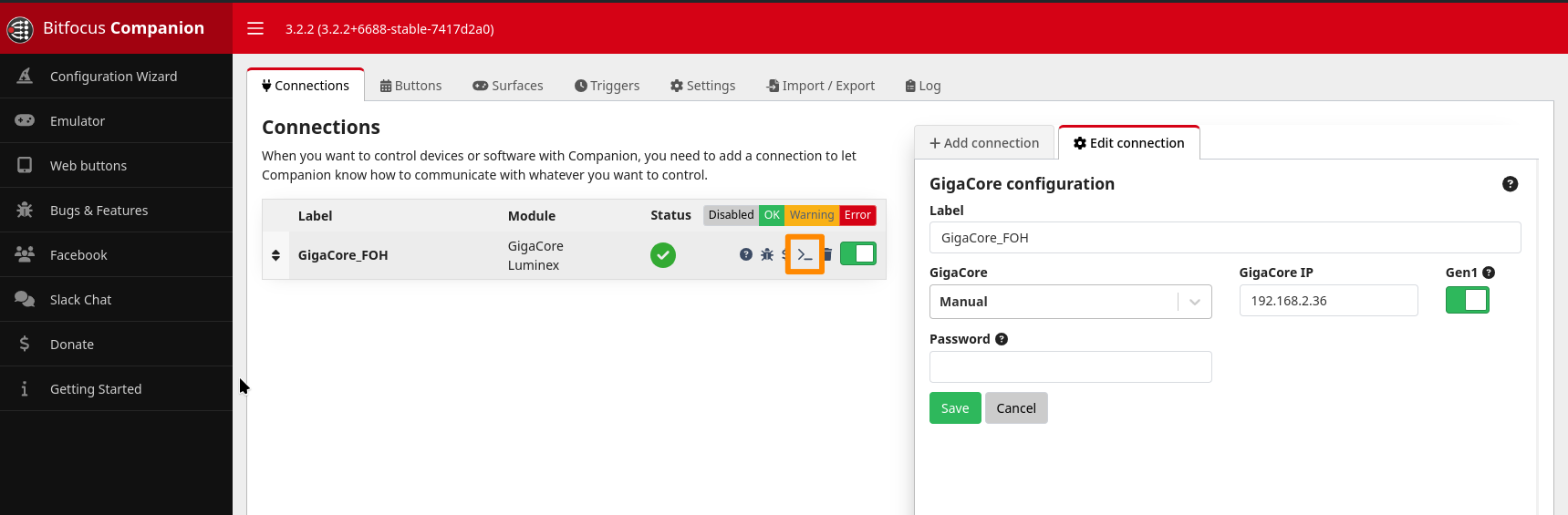 It is now possible to add another connection to a GigaCore or any other device supported by Companion. Once this is done, go to 'Settings' and make sure the Grid size matches the grid size of your Streamdeck. Note that Companion can also be used with other input devices or with the Web emulator. A web emulator can be added in the 'Surfaces' tab.