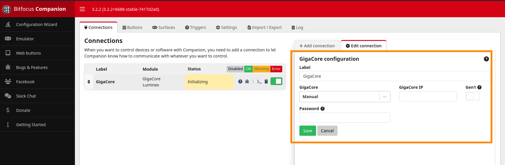 Once the connection is added, it has to be configured so the software can reach the GigaCore. For this, it is important that the PC on which Bitfocus Companion is installed, is connected to the management group of the GigaCore and has an IP address in the same IP range as the GigaCore. You can verify this connectivity by accessing the GigaCore web-interface.