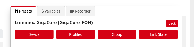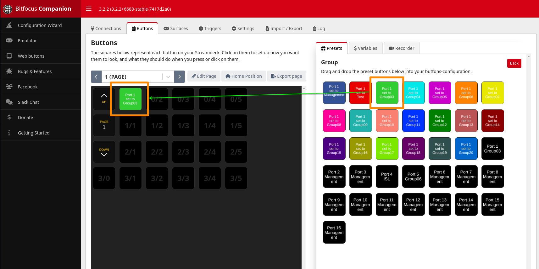 On the bottom half, actions can be associated to the button. Multiple actions can be assigned to the same button, these actions can trigger the same or different devices. This can for example be used to configure groups on multiple ports across multiple switches.