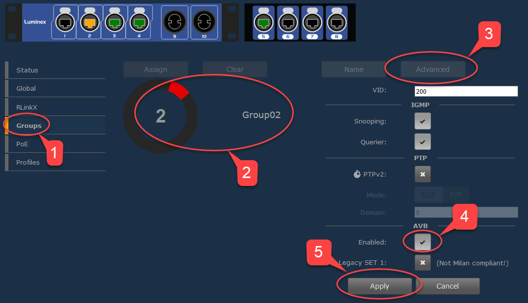 In these profiles, AVB is enabled on Group 1. All ports are assigned to Group 1 by default.