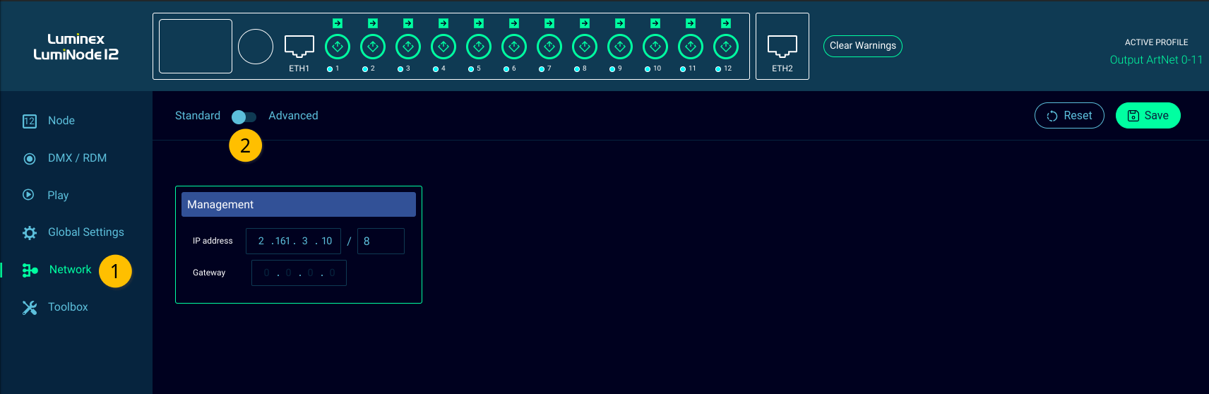 - Go the "Network" tab in the LumiNode web interface (1) and select 'Advanced' networking mode (2):