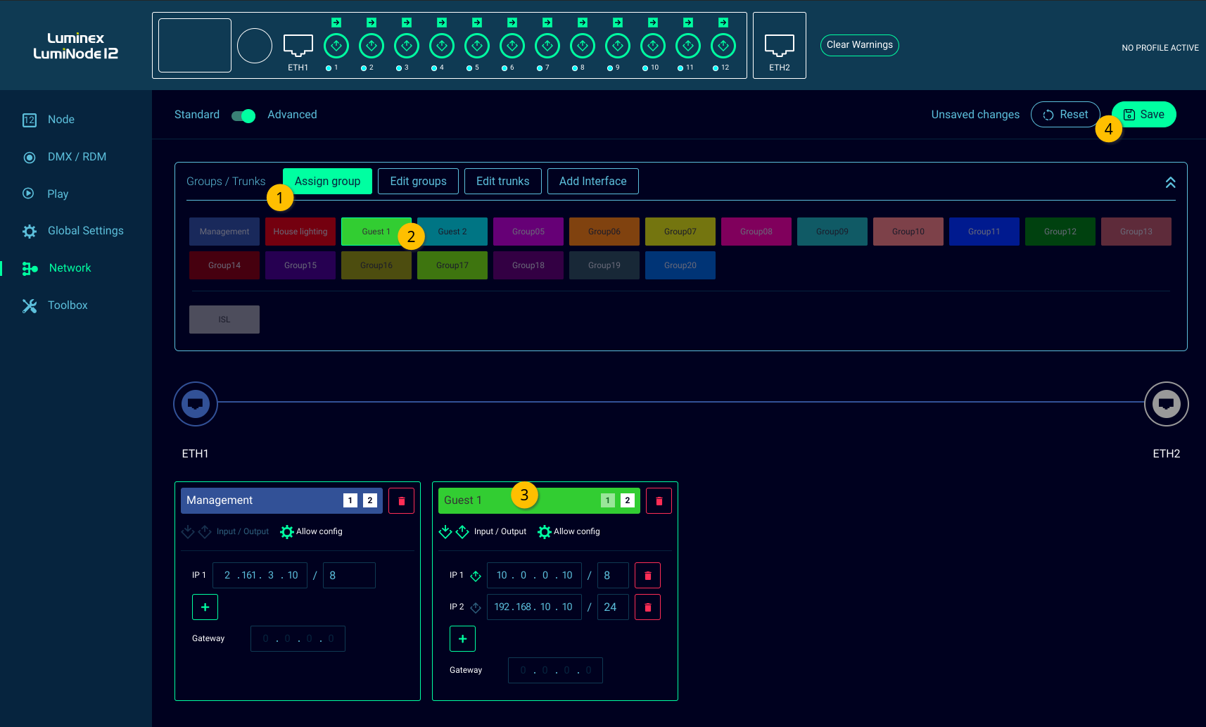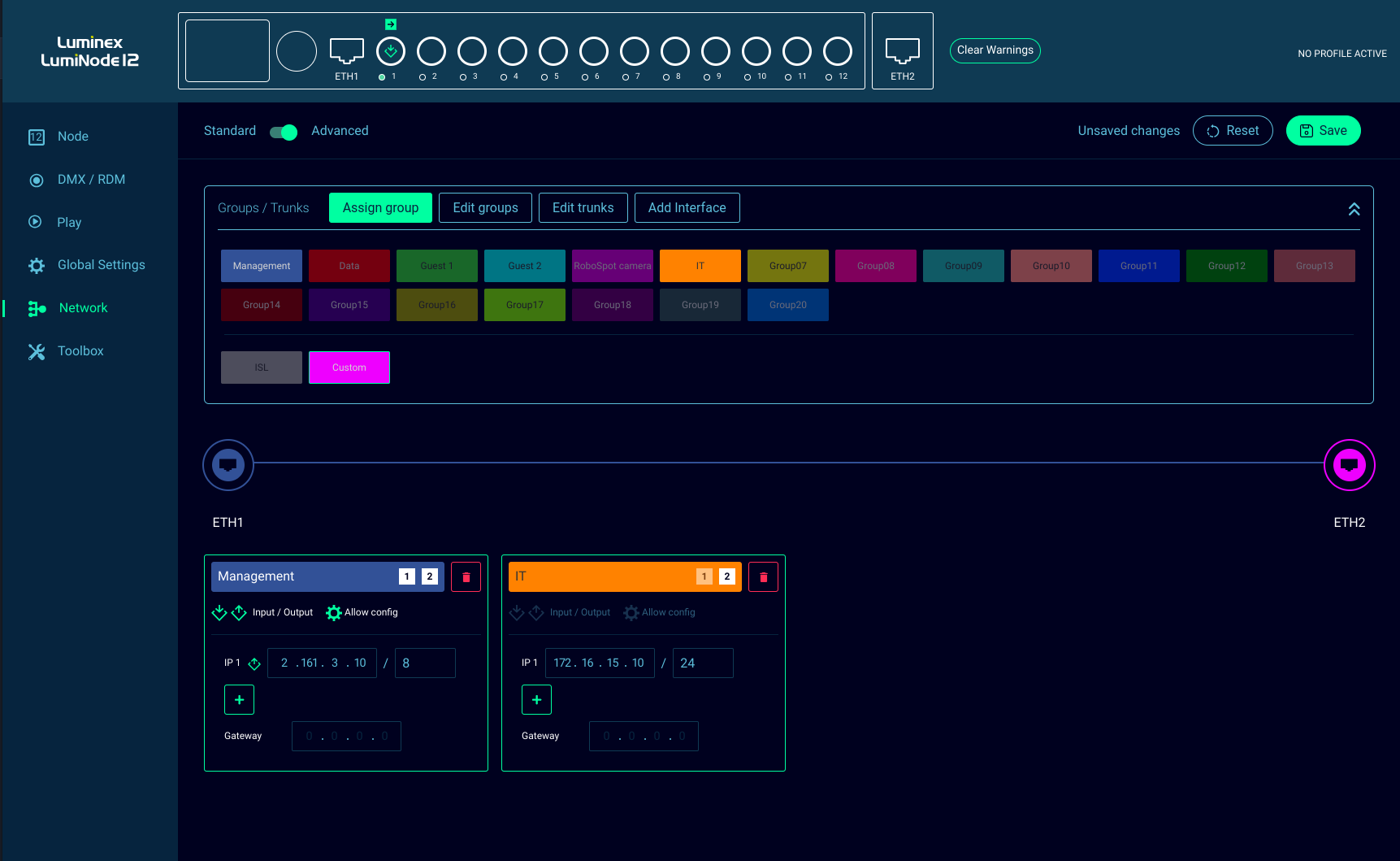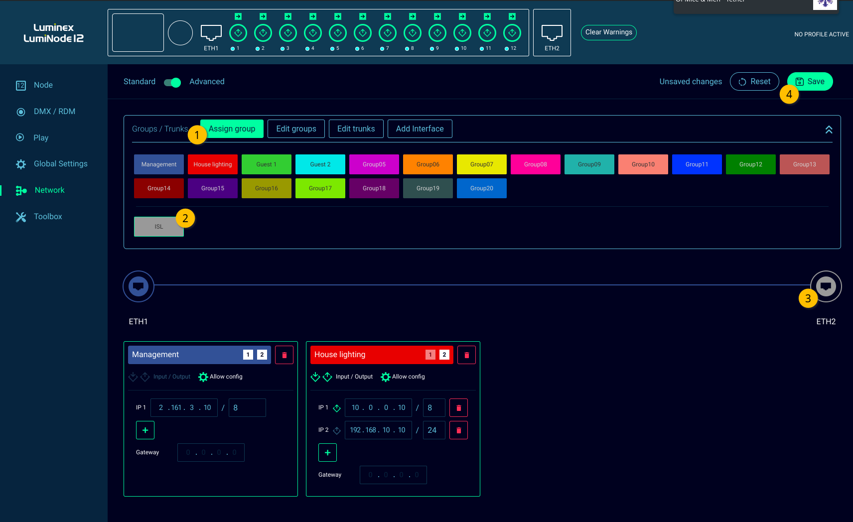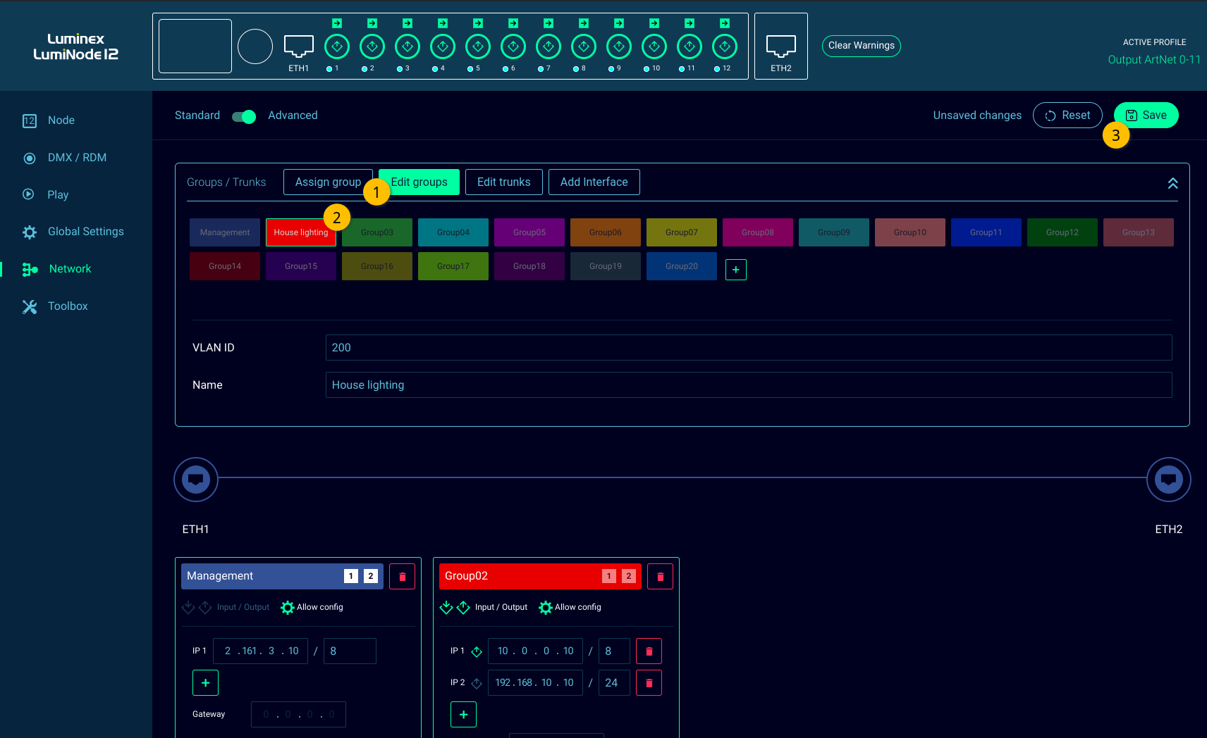Warning! This is advanced network configuration. Changing the group and trunk assignment can result in the LumiNode becoming unreachable when not configured correctly.