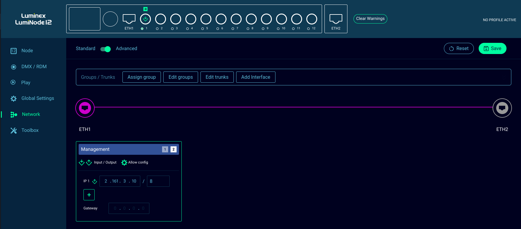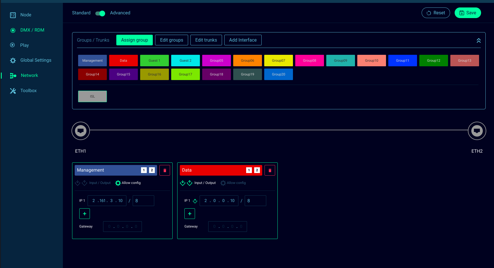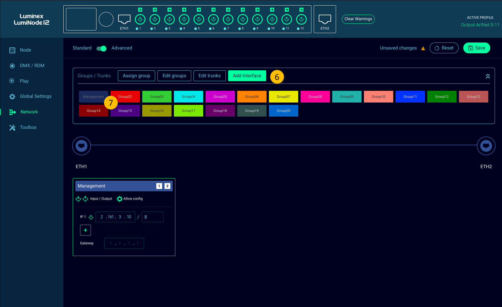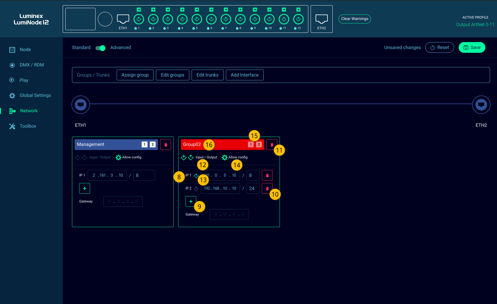 Warning! This is advanced network configuration. Changing the group and trunk assignment can result in the LumiNode becoming unreachable when not configured correctly.