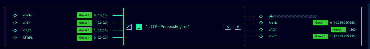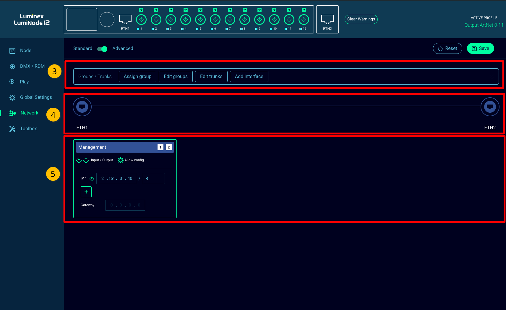 The lighting data input/output and the management of the LumiNode are all assigned to the same network group and share a single IP address.
