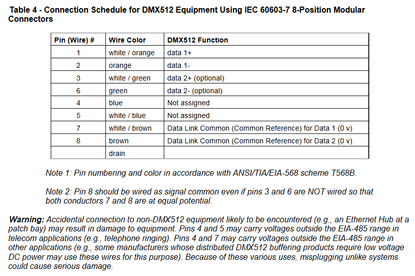 Pinout for RJ45/Ethercon DMX connectors on Luminex devices