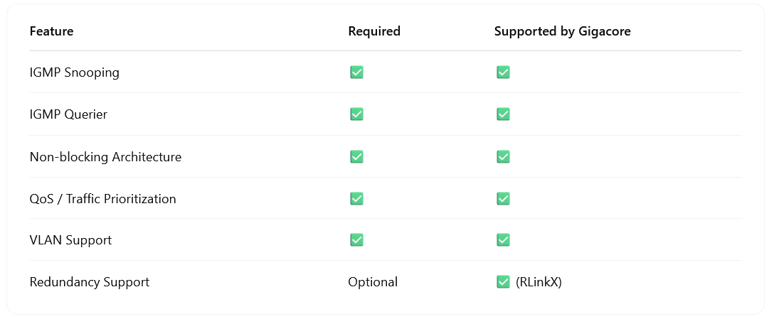 Requirement: Layer 2/3 switches with AV-friendly QoS profiles and low internal latency.